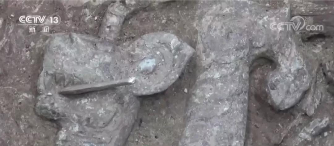 考古人员发现,龙形象身前无配重,身体主体超出基座,为确保重心稳固极可能倚靠在其他器物上,那残缺的部分又在哪里?经过搜寻,与之相隔约半米,他们找到了关键线索——顶觚形尊蛇身人像。人像双手撑在方形底座上,身体同样向上翻转,同样需要倚靠其他物体才能保持稳定。