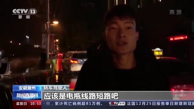 轿车驾驶人:应该是电瓶线路短路,我看车有点煳味、冒烟,就把车靠边停,然后打110、119报警了。