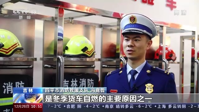四平市消防救援支队 冯竟哲:轮毂过热起火,是冬季货车自燃的主要原因之一。货车自重大、货物重,驾驶人长时间连续行驶,加上在行驶过程中频繁制动,容易引发轮毂过热,导致车辆自燃的发生。