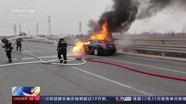 不仅是市区道路和国道,12月23日中午,在天津东丽区一快速公路上,一辆小轿车行驶途中发生自燃,大火很快将车头和驾驶室引燃。