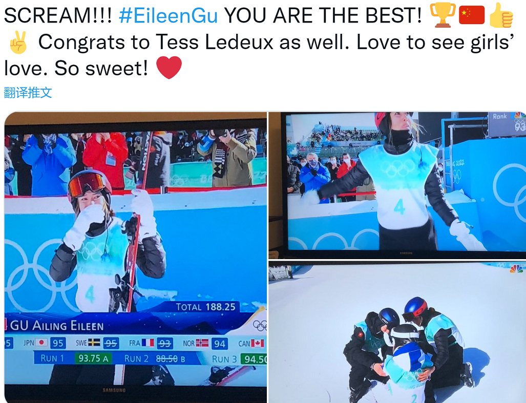 美国体育新闻网站《运动员》副主编卢卡斯·威斯也对谷爱凌的表现大为称赞,他说,“我们乐见运动员之间的这种关怀和友爱。”欧洲体育频道(Eurosport)在一条置顶的推文中,发布了谷爱凌安慰勒德的现场视频,并配上文字,“这就是奥运会的全部意义。”