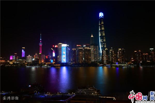 资料图:2022年4月10日晚,上海外滩的大屏上显示出“上海加油”的标语。中新社记者 田雨昊 摄