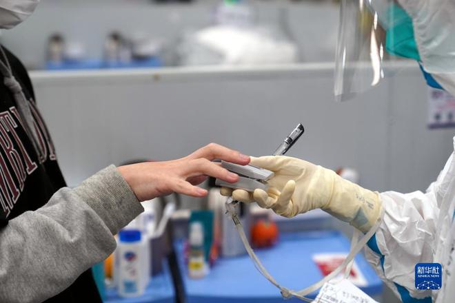 4月28日,在上海临港方舱医院内,医护人员为感染者测量血氧饱和度。 “五一”国际劳动节前夕,上海临港方舱医院的3800多名医护人员和2000多名工勤人员正奋战在抗疫一线。救治照护感染者、保障方舱医院运行,他们在各自岗位上坚守忙碌、日夜奋战。 新华社记者 杨有宗 摄