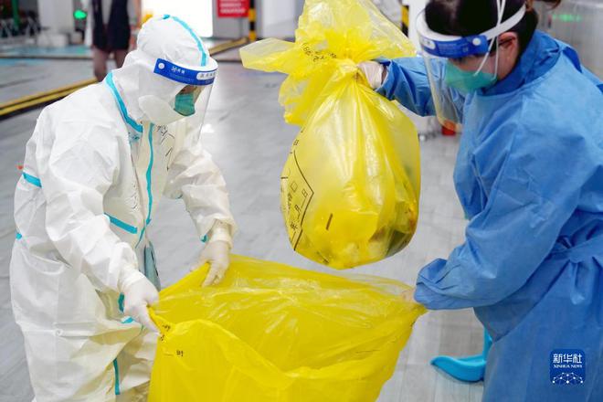 4月28日,在上海临港方舱医院,一名保洁员和一名志愿者在清运生活垃圾。 “五一”国际劳动节前夕,上海临港方舱医院的3800多名医护人员和2000多名工勤人员正奋战在抗疫一线。救治照护感染者、保障方舱医院运行,他们在各自岗位上坚守忙碌、日夜奋战。 新华社记者 杨有宗 摄