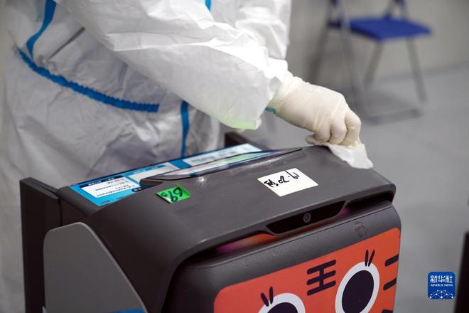 4月28日,在上海临港方舱医院,工作人员在擦拭送餐机器人。 “五一”国际劳动节前夕,上海临港方舱医院的3800多名医护人员和2000多名工勤人员正奋战在抗疫一线。救治照护感染者、保障方舱医院运行,他们在各自岗位上坚守忙碌、日夜奋战。 新华社记者 杨有宗 摄