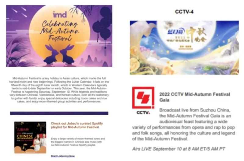 中秋前一天,总台欧拉中心在多语种新媒体平台播发视频节目《中秋节的古韵新意》,展现家庭团圆等中华传统与收看秋晚等现代生活方式的结合,讲述中国人“每逢佳节倍思亲”的乡情乡愁,反映中秋节作为中华文化基因纽带之一历久弥新,总阅览量超110万。