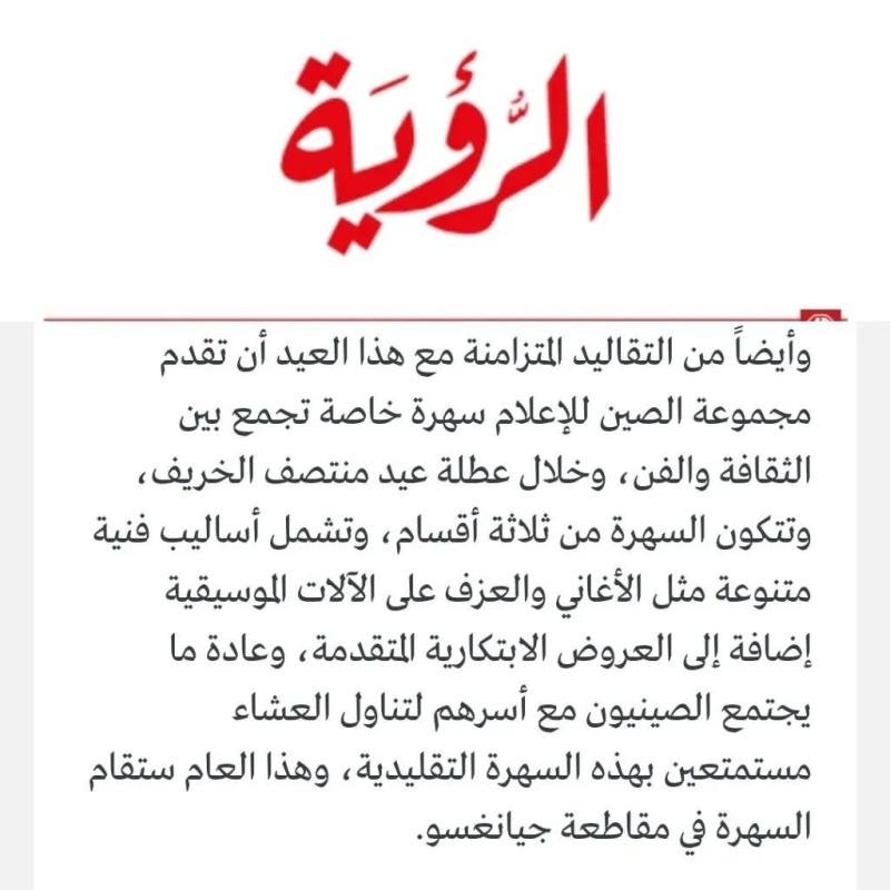 中东总站记者9月10日在阿曼头部媒体《观点报》发表署名文章《秋晚与中华儿女的情感中秋》。文章介绍,今年总台秋晚为全世界带来了一场兼具思想、艺术和科技的视听文娱盛宴。观看总台秋晚已成为全球华人欢度中秋佳节的重要方式,寄托了海内外中华儿女浓浓思乡之情和拳拳爱国之心。