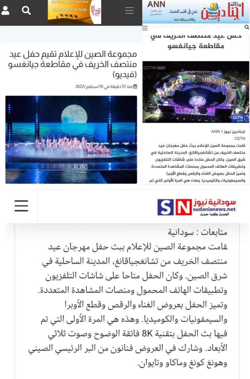 总台中东总站向阿尔及利亚丝路新闻网、伊拉克阿杰纳丁通讯社、苏丹人新闻网等媒体投送编译稿件《以技术创新为驱动的总台秋晚》,重点介绍今年总台秋晚首次采用8K超高清技术和三维菁彩声技术制作播出。