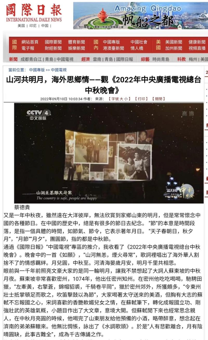 国际传播规划局围绕总台秋晚面向海外华文媒体广泛推送“中秋佳节话团圆——中秋专题”融媒体报道,美国《国际日报》、英国CHINA HOUR、俄罗斯《龙报》、法国《欧洲时报》、葡萄牙“葡新网”、意大利侨网、南非《非洲时报》、日本华商网等海外华文媒体刊载转发。现居美国洛杉矶的退休教授蔡德贵先生观看秋晚后,在美国《国际日报》发表署名文章,盛赞总台秋晚“用浓浓的文化气息架起了海内外沟通、联系的桥梁,以人类命运共同体这一纽带汇成月圆人团圆、家和万事兴的期盼。”