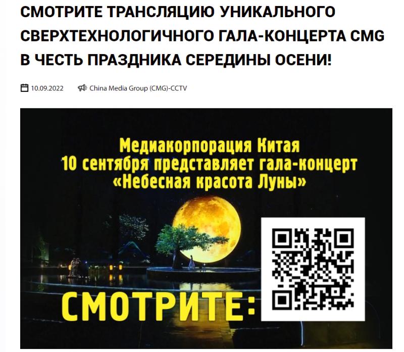 点击网站,扫码即看!9月10日,总台亚欧总站与俄罗斯大亚洲电视台合作,在其网站发布总台秋晚直播二维码,受众可通过扫码观看晚会实况。同时,该电视台还详细介绍了晚会亮点以及中秋节在中国文化传统中的重要意义和民间庆祝方式。