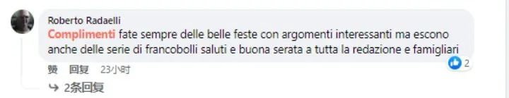 网友Roberto Radaelli留言评论道:“祝贺你们!你们总是能给节日选取非常有创意的主题,并且制作出非常精良的节目,向主创团队和你们的家人致以节日的问候。”