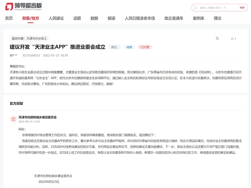 小区里,一枝一叶,看似不起眼的小事,却关乎着每位居民的切身利益。在加强社区民主管理和民主监督的过程中,征求业主意见、成立业主大会等工作尤为受到关注。近期,天津网友通过人民网“领导留言板”建言:建议开通手机端投票系统解决业主大会投票难题,推进业委会成立。对此,天津市住房和城乡建设委员会做出答复,“天津业主APP”研发工作正在推动,投票系统尽快投入使用。