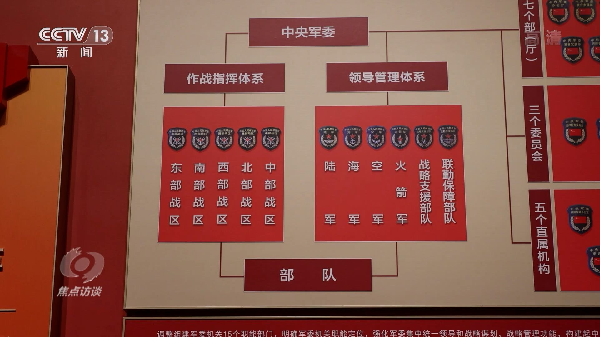 曹志宇介绍说:“这块展板是推进军改三大战役的第一次战役,也是俗话说的“脖子”以上改革的举措,打破了原来四总部体制、大军区体制、大陆军体制,建立起了军委、战区、部队的作战指挥体系和军委、军种、部队的管理建设体系,通俗一点讲就是军委抓总,下面战区专司打仗,可以把战区内所有军种的作战单位进行联合。”