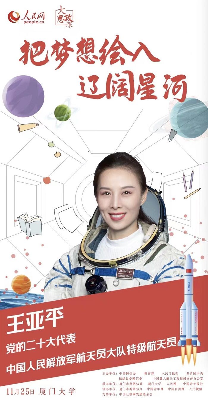 王亚平此番将向厦门大学同学们讲述她“把梦想绘入辽阔星河”的故事。