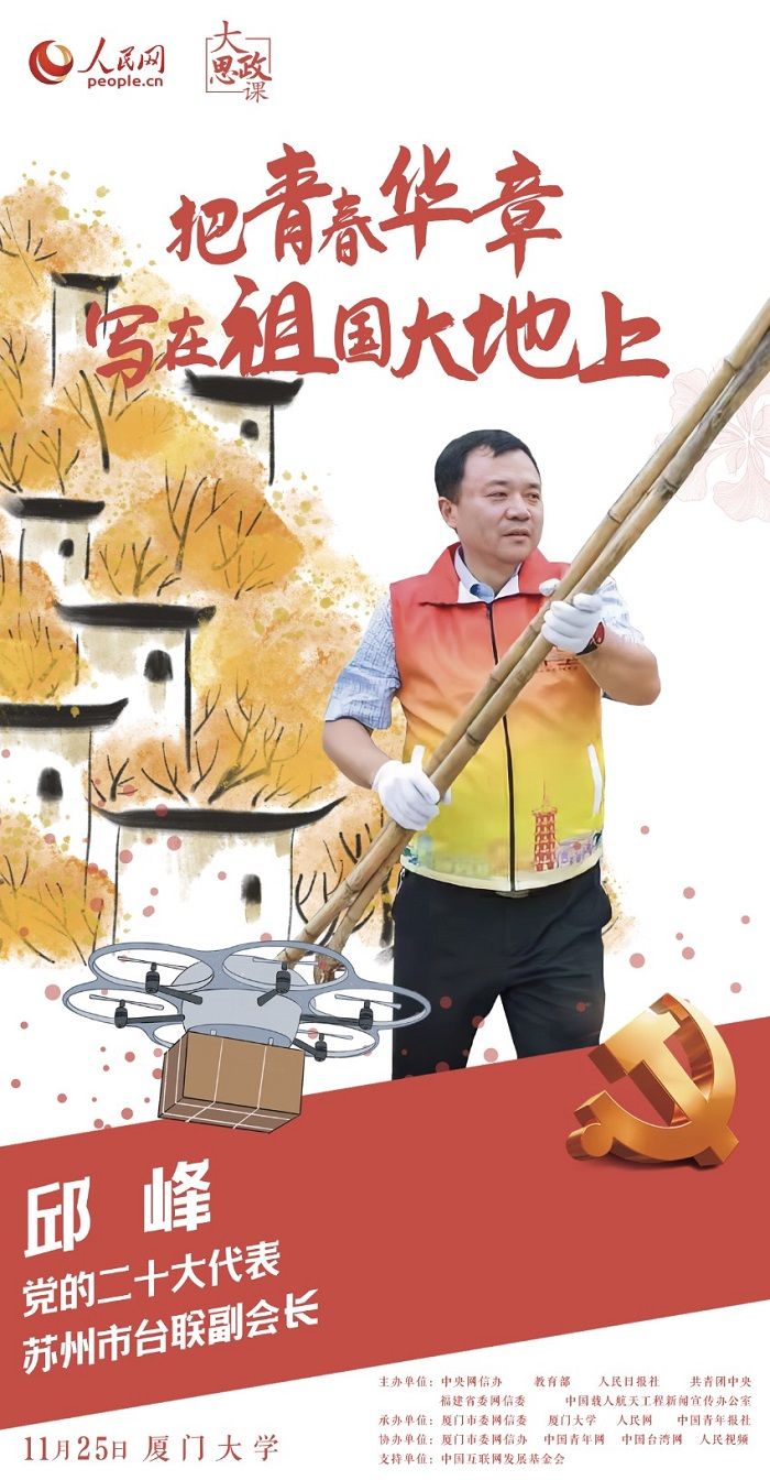 祖籍台湾屏东,在江苏苏州出生,邱峰是党的二十大台湾省籍党员代表,他既是台胞的代表,也是“三农”条线的代言人。作为“三农”工作青年骨干,邱峰喜欢奋斗在第一线。这些年,他和同事们跑遍了苏州79个涉农乡镇、1028个行政村、近万个自然村庄。