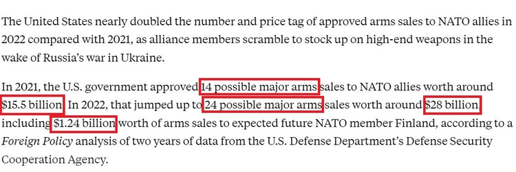 美国《外交政策》杂志:根据美国国防部数据,2021年美政府批准了14项对北约成员国的军售计划,总金额约为155亿美元;2022年美政府批准了24项对北约成员国的军售计划,总金额约280亿美元,其中包括对未来北约成员国芬兰出售价值12.4亿美元的武器。