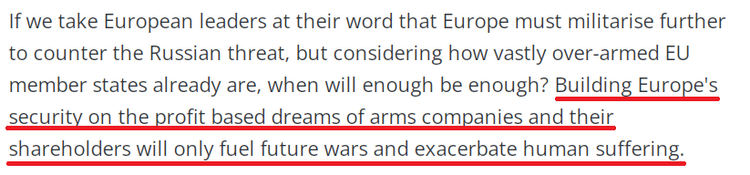 由此,原本可以投资于社会服务等领域的巨额资金被用于研发和采购武器。然而,“将欧洲的安全建立在军工企业及其投资者基于利润的梦想之上,只会助长未来的战争并加剧人类的苦难”。