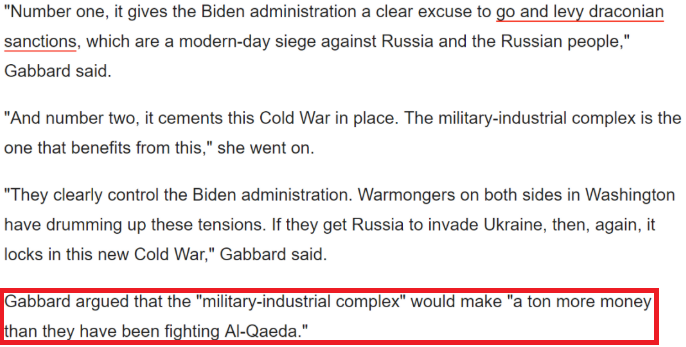 美国《新闻周刊》:加巴德在接受采访时怒斥美国两党的战争贩子都在煽动紧张局势,因为军工复合体将比他们与“基地”组织作战赚的多得多。