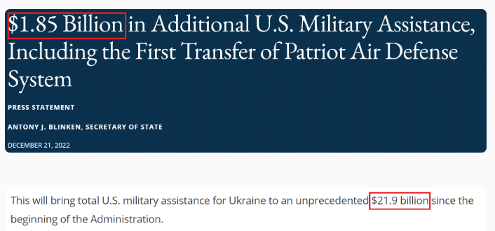 截至去年12月底美国承诺的最新一笔军事援助,拜登政府上台以来已为乌克兰提供219亿美元军援。