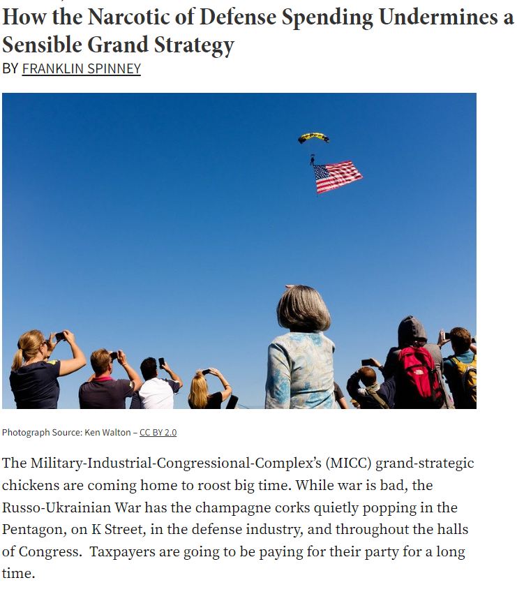 “俄乌冲突爆发以来,五角大楼(美国国防部)、K街(华盛顿游说公司聚集地)、军工企业以及整个国会大厦内,都在悄悄地开香槟庆祝,而纳税人将为这场派对买单很久。”