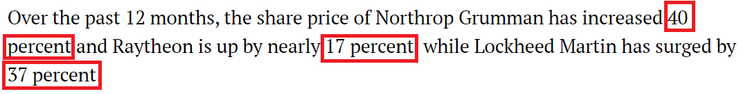 “世界社会主义”网站:过去12个月,美国大型军工企业诺思罗普·格鲁曼公司、洛克希德·马丁公司和雷神技术公司的股票分别上涨了40%、37%和17%。