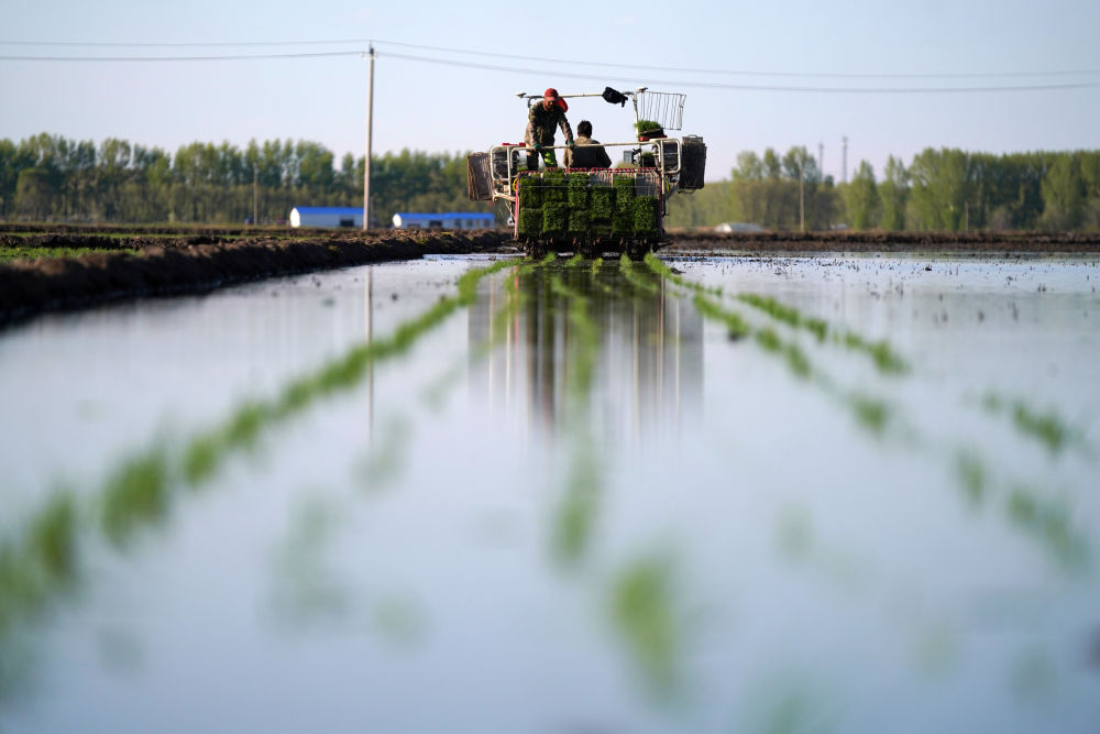 在北大荒集团建三江分公司七星农场有限公司的稻田中,种植户在进行插秧作业(2022年5月18日摄)。新华社记者 王建威 摄