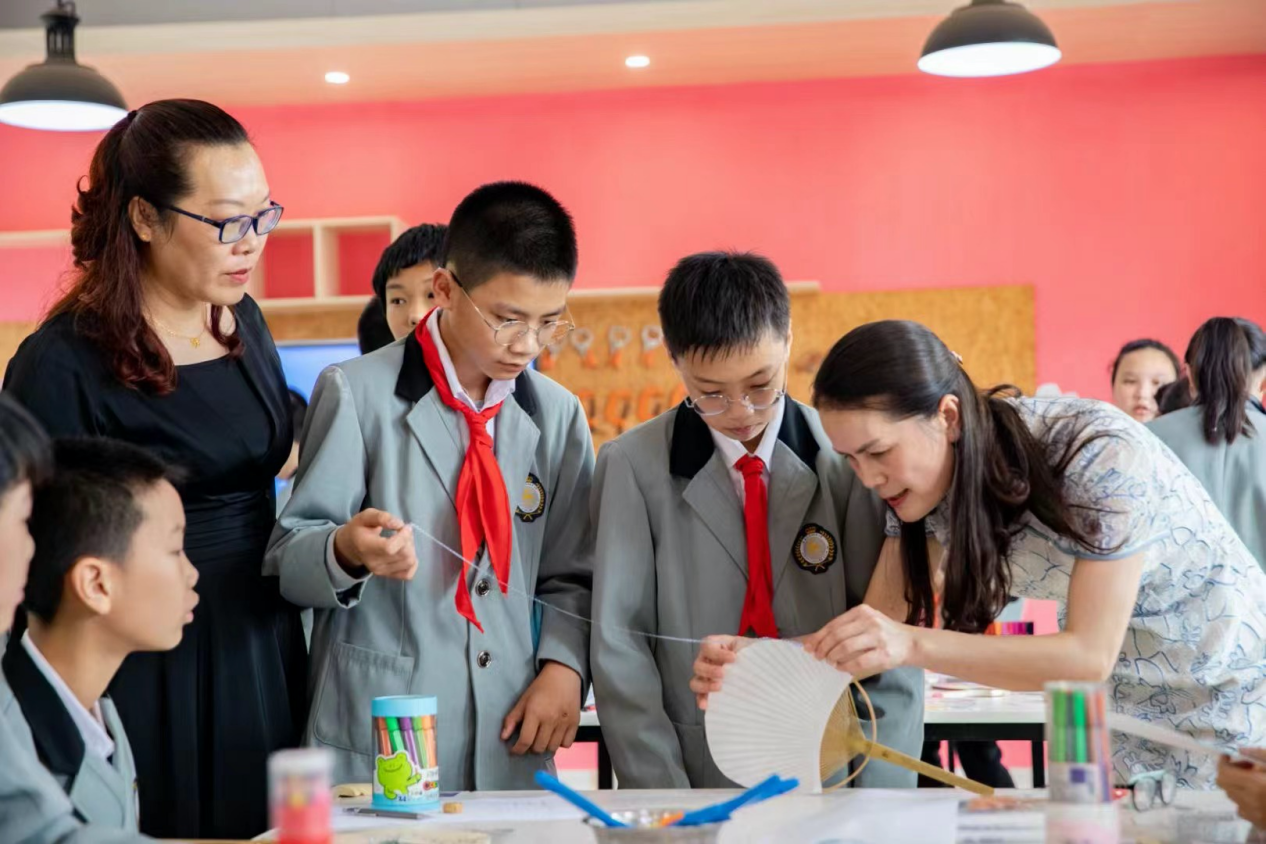 邱燕珍(右一)走进校园传授团扇技艺(央广网发 何丽红 摄)