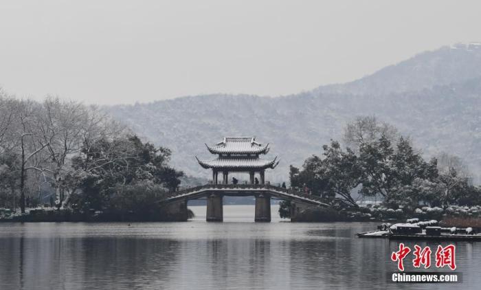 西湖玉带桥被大雪覆盖后如水墨画。中新社记者 王远 摄