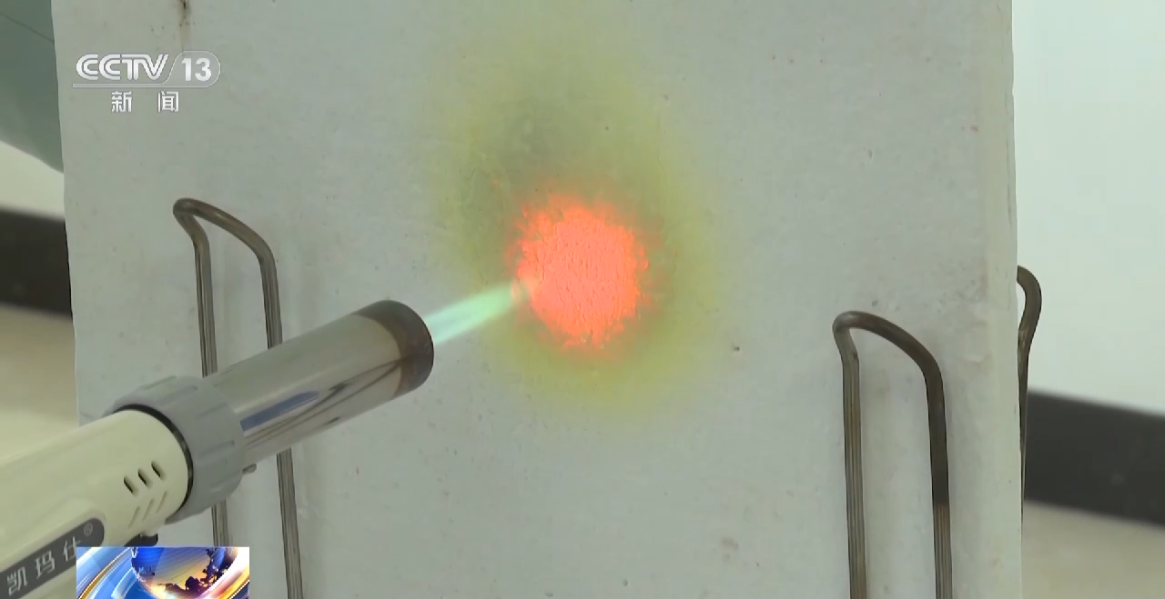广东埃力生公司总经理助理 郑亚莉:气凝胶它有一个非常好的隔热性能,不会有任何的有毒害烟气。这个喷枪它的火焰温度有1200多度。火灼烧的部分呈一个红色或者是黄色的状态,但是在它背面,用手直接触摸,不会有任何的问题。