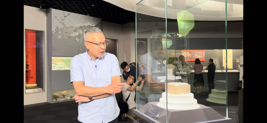 方向明在展厅内介绍良渚遗址出土的“琮王”