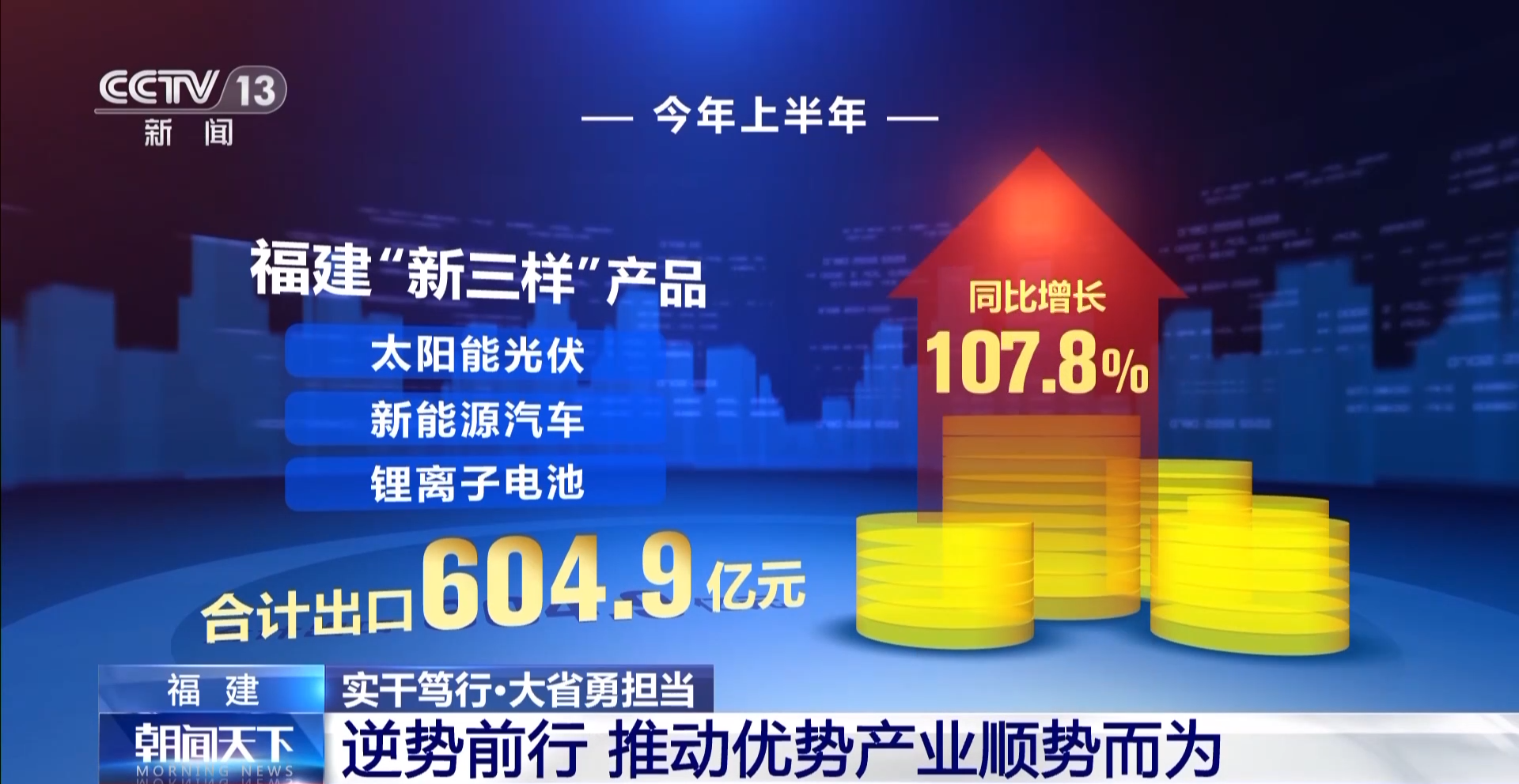 今年上半年,被称为福建省“新三样”的锂离子蓄电池、电动载人汽车、太阳能电池,合计出口604.9亿元,同比增长107.8%。