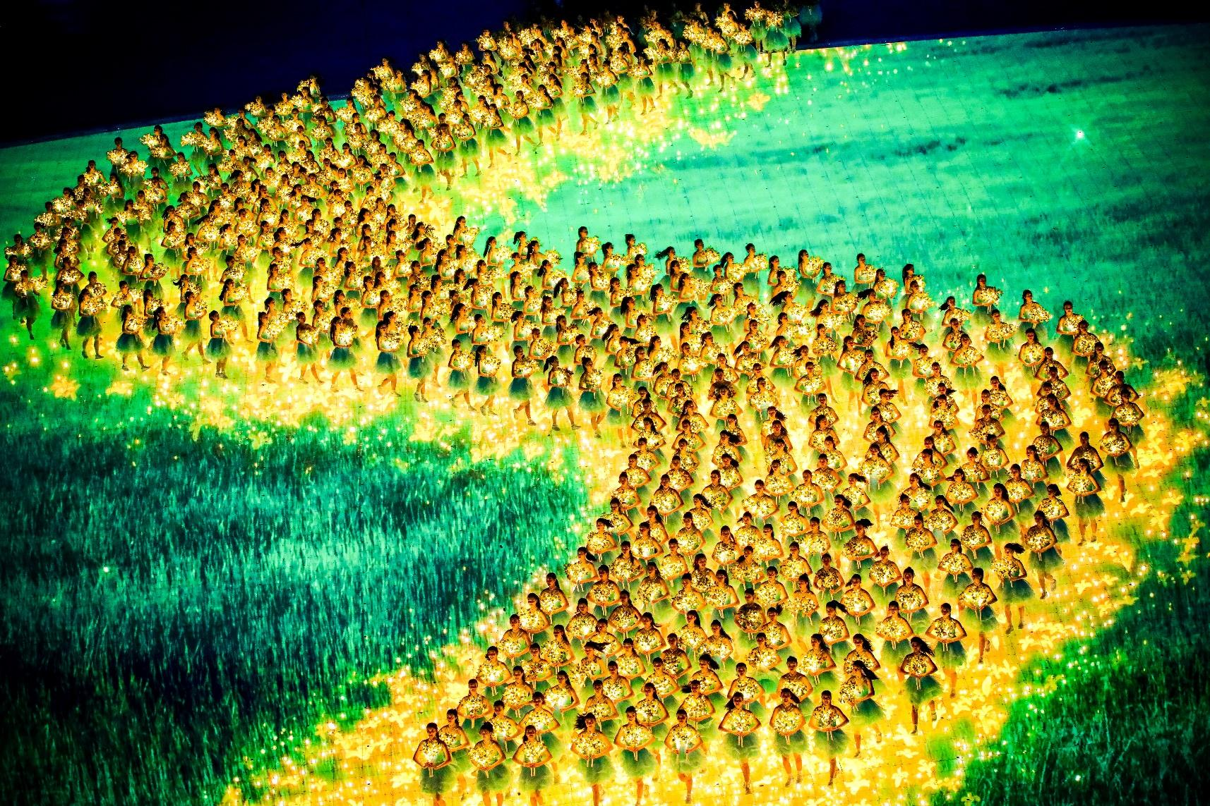 开幕式上,近24000块屏幕组成的6000平方米地屏,给全世界的观众带来了极具震撼的视觉享受。开幕式结束后,地屏很快被移除,并恢复成草坪保障田径比赛顺利进行。
