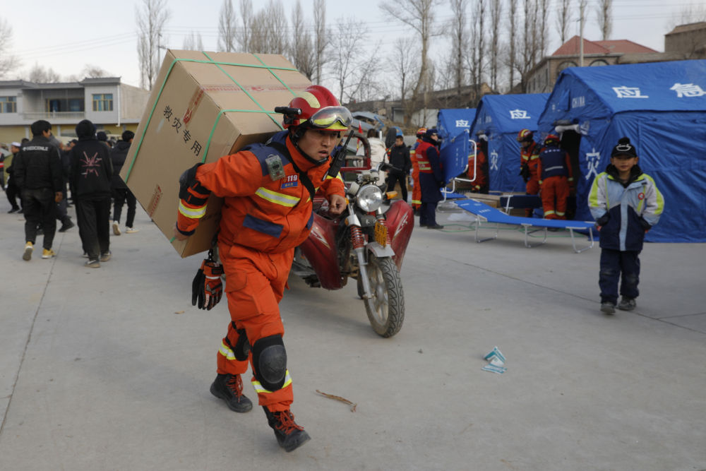 ↑ 12月19日,在甘肃临夏积石山县大河家镇大河村安置点,消防人员在搬运救援物资。新华社记者方欣摄