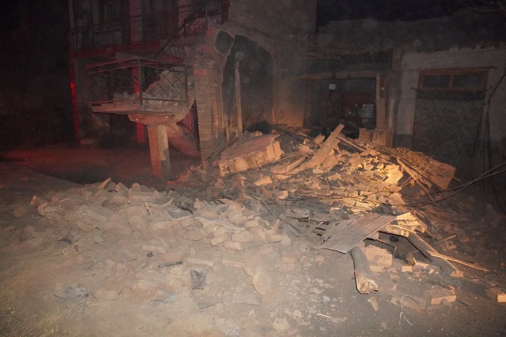 ↑ 12月19日凌晨在甘肃省临夏回族自治州积石山保安族东乡族撒拉族自治县大河家镇陈家村拍摄的一处倒塌的房屋。新华社记者马希平摄