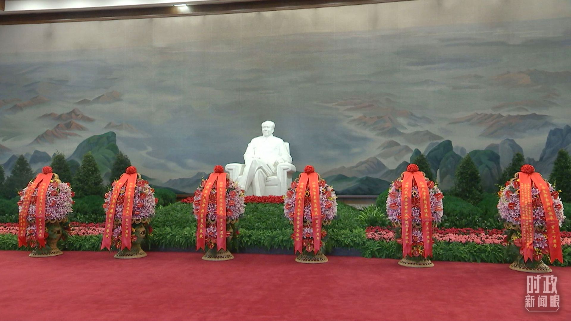 △座谈会前,习近平等领导同志来到毛主席纪念堂。北大厅内,中共中央,全国人大常委会,国务院,全国政协,中央军委,各民主党派、全国工商联和无党派爱国人士敬献的花篮摆放在毛泽东同志坐像正前方。(总台央视记者郭鸿拍摄)