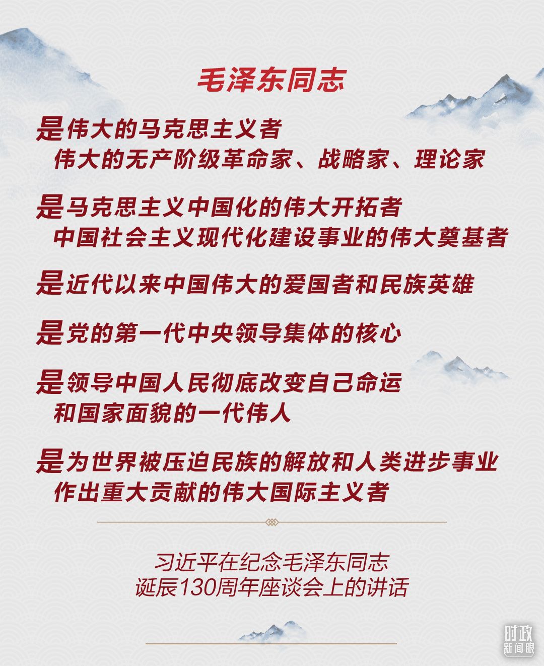 《时政新闻眼》注意到,与10年前的讲话相比,总书记在今年这次座谈会上增加了两个新的表述:毛泽东同志是“中国社会主义现代化建设事业的伟大奠基者”,“是为世界被压迫民族的解放和人类进步事业作出重大贡献的伟大国际主义者”。