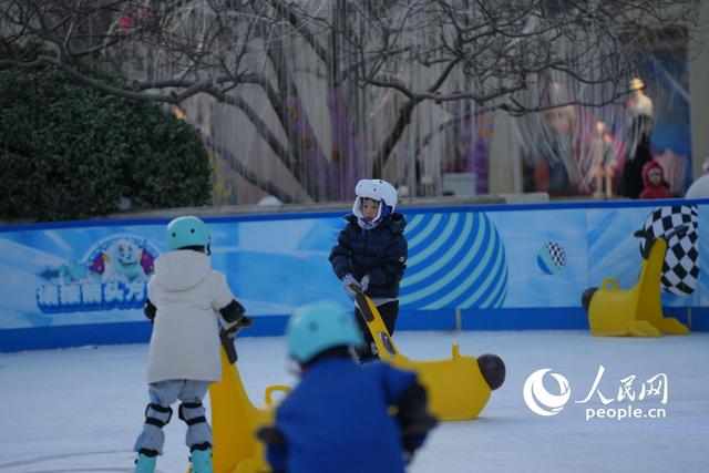 在北京市朝阳区某商业广场里的人工冰场,孩子们正在体验滑冰运动。人民网记者 王天乐摄