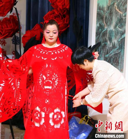 扎伊诺·毛尼亚孜在工作人员的帮助下穿戴“龙凤呈祥”剪纸时装。韩欢欢 摄