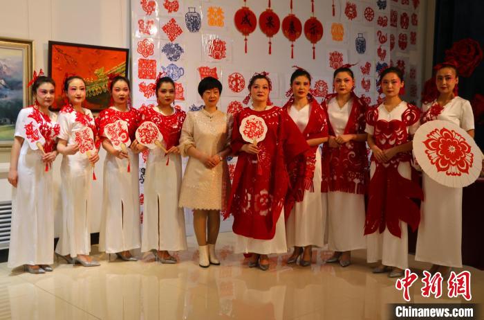 9名身着龙凤呈祥、年年有余(鱼)、富贵牡丹等主题红色剪纸服饰的女子,在悠扬的乐曲中款款走秀,让国家级“非遗”——中国剪纸流动起来。韩欢欢 摄