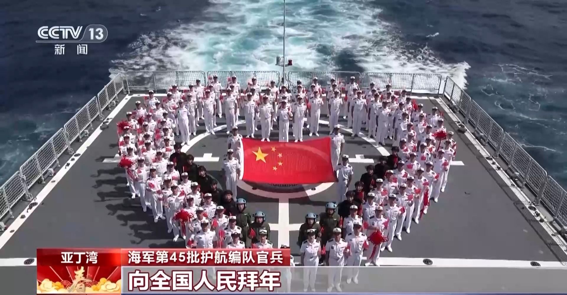海军第45批护航编队官兵:海军第45批护航编队,向全国人民拜年。祝伟大祖国繁荣昌盛,人民幸福安康。战位有我,请祖国和人民放心!