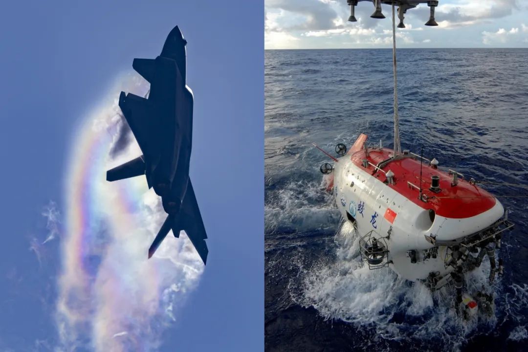 “威龙”歼-20隐身战斗机(左),蛟龙号载人潜水器(右)。