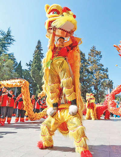 春节假期,贵州毕节市舞狮队在七星关区表演。