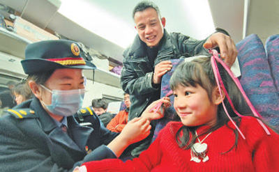 大年初二,江西南昌开往福建福州的D6501次列车上,乘务人员给小旅客佩戴中国风头饰。