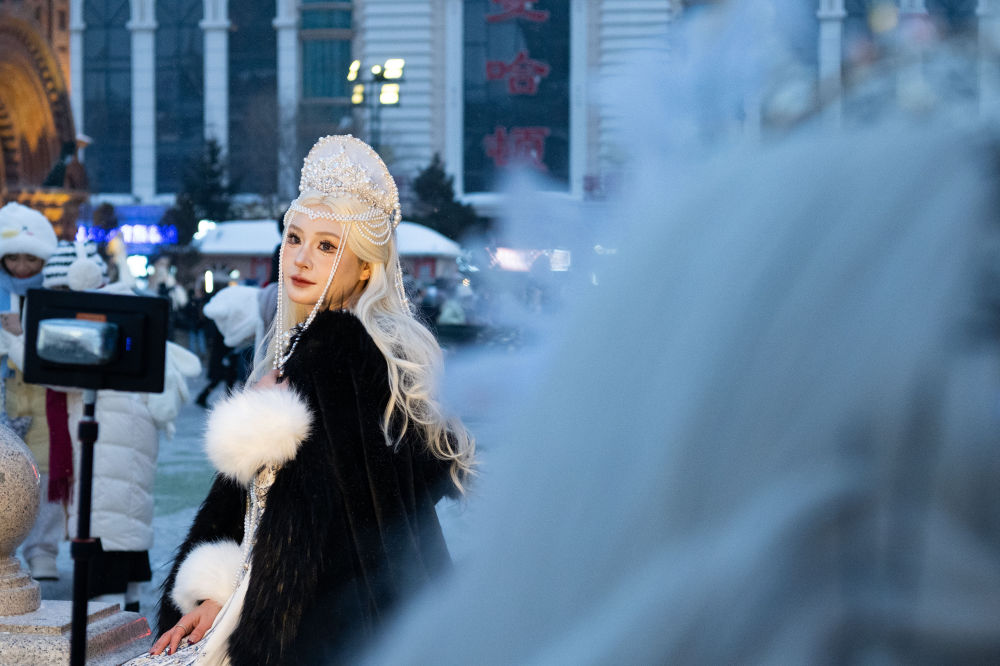 2月12日,旅拍游客在哈尔滨建筑艺术广场身着盛装拍照。新华社记者 王建威 摄