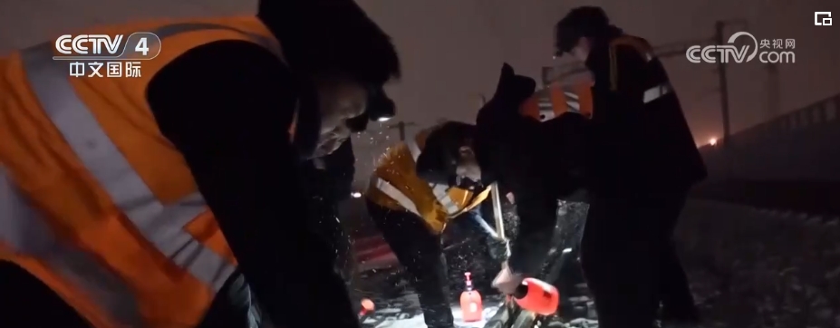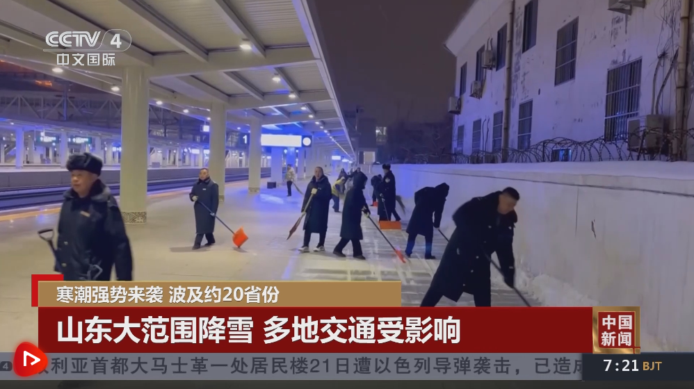 山东省内的多趟列车出现晚点、停运。为保障旅客出行安全,山东各大火车站工作人员对进站口、站台、道岔等开展清冰除雪作业。