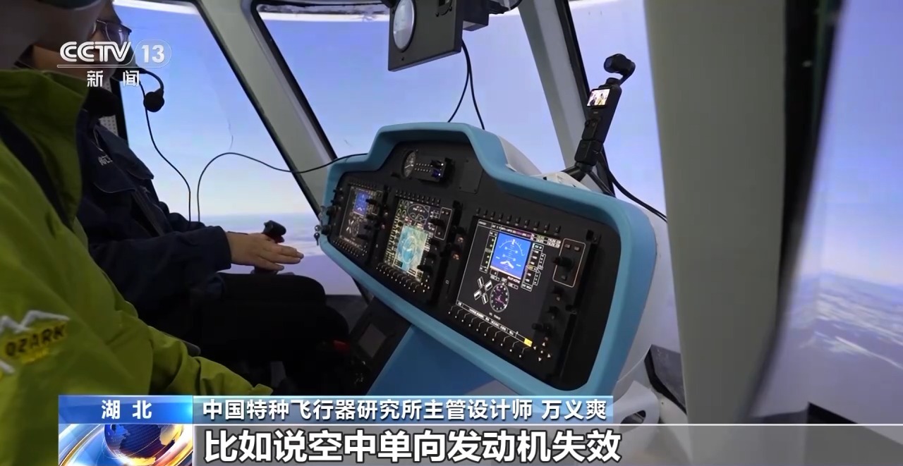 中国特种飞行器研究所主管设计师 万义爽:实际操纵可以模拟正常的五边飞行,比如起降、爬升、巡航、再往下俯冲,最后正常降落,这是正常五边飞行的训练科目。还有各种特情情况下,比如说空中单向发动机失效、双发失效这种特情情况,飞行员也可以进行模拟训练。如果在这上面提前熟悉了各种各样工况,对于飞行员来说,操作更熟练。