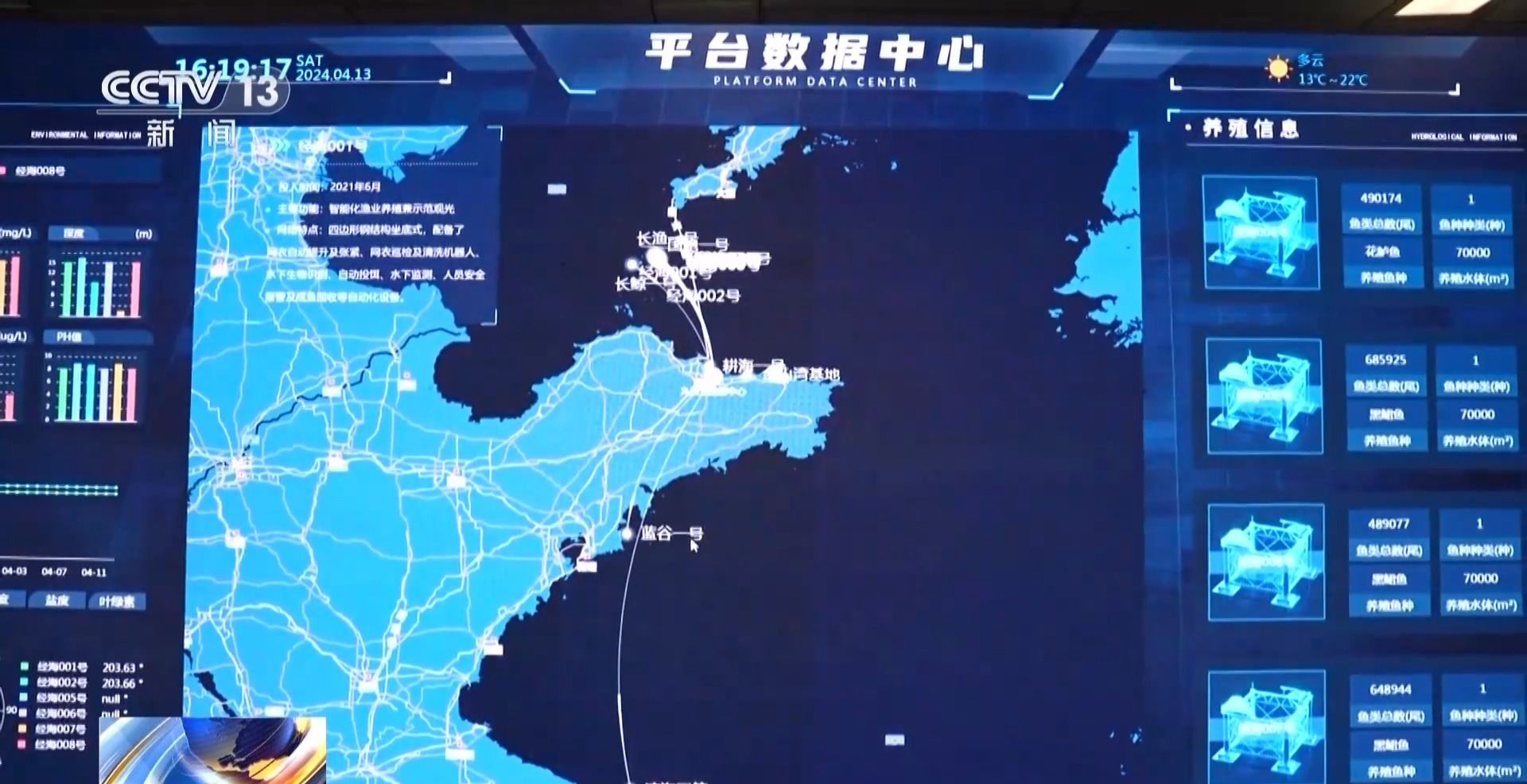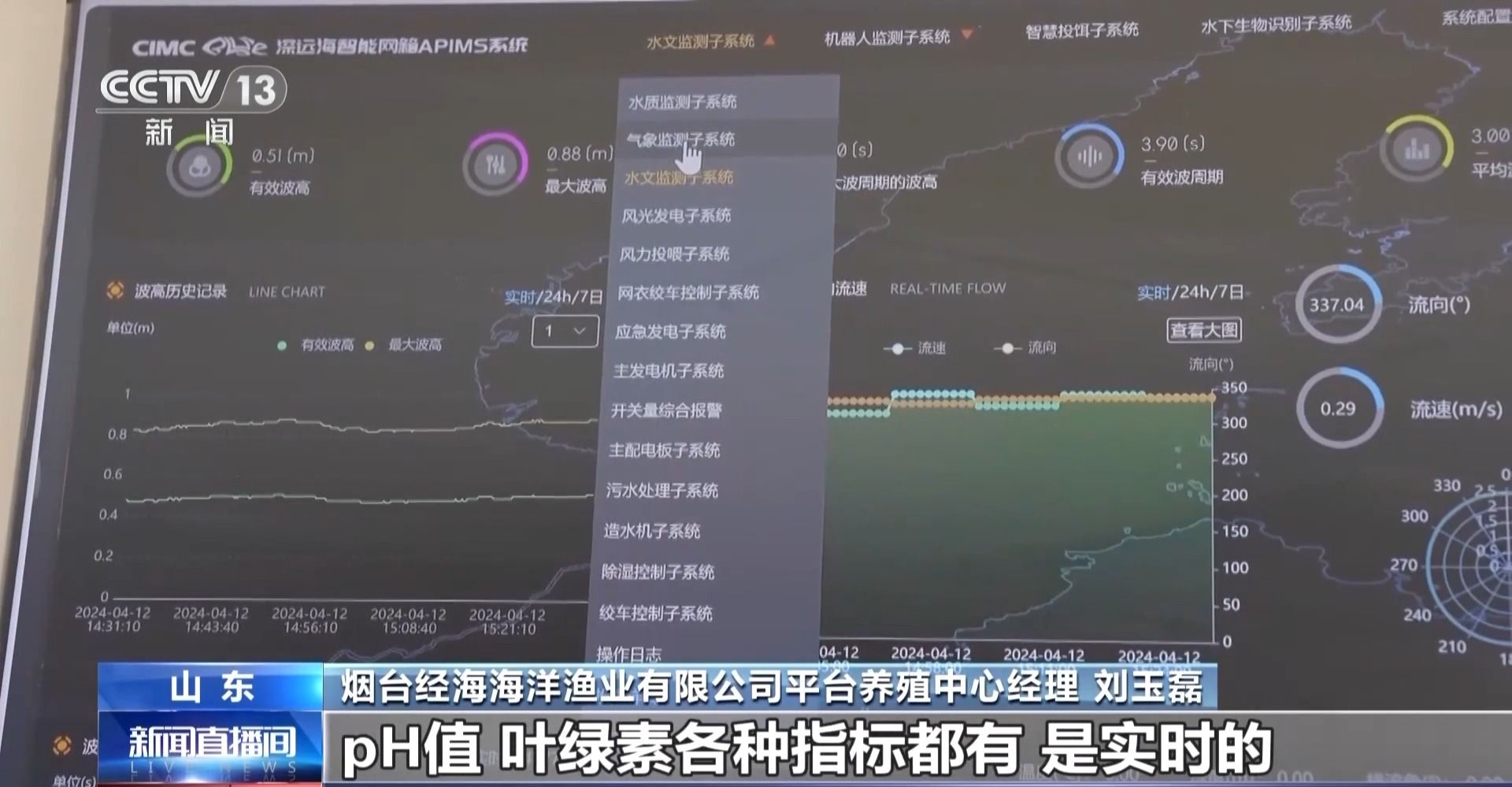 烟台经海海洋渔业有限公司平台养殖中心经理 刘玉磊:通过水质监测系统,能够看到水温、盐度、溶解氧、pH值、叶绿素……各种指标都有,是实时的。反馈到后台以后,会有及时数据分析。