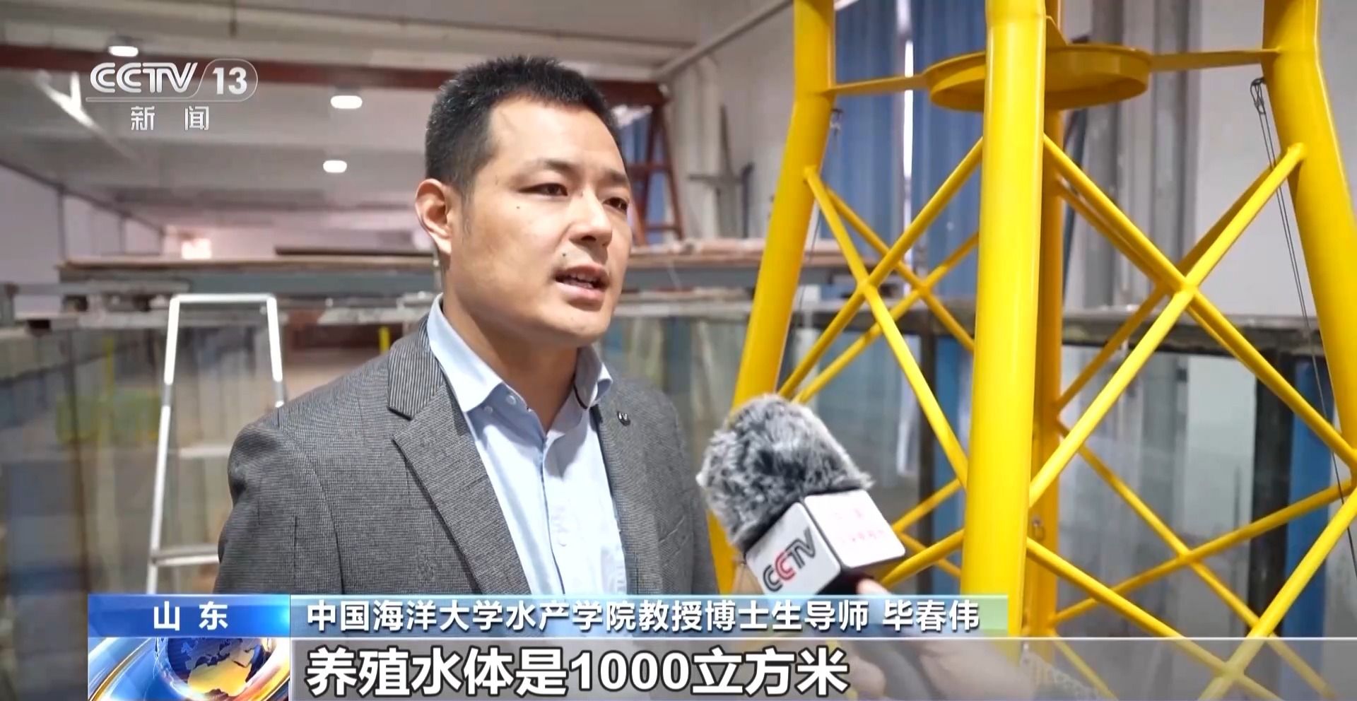 中国海洋大学水产学院教授博士生导师 毕春伟:这是海上风电和海上渔业融合的设施,网箱尺寸是边长为10米,养殖水体是1000立方米。因为是试验性的,所以养殖水体并不是很大,养鱼量可以达到年产15吨成品鱼。