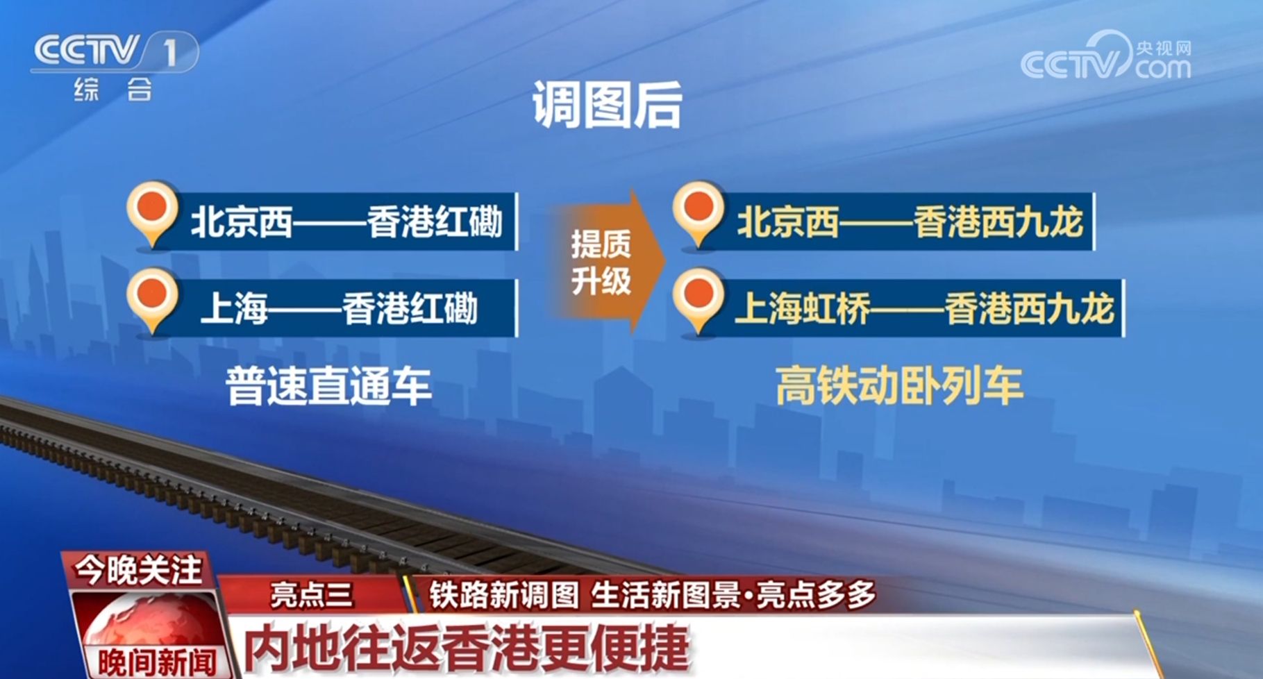 调图后,北京西、上海与香港红磡站间开行的普速直通车,提质升级为北京西、上海虹桥与香港西九龙站间的高铁动卧列车。北京至香港的全程旅行时间由原来的24小时31分压缩至12小时34分,上海到香港从19小时34分压缩至11小时14分。京港、沪港间实现夕发朝至,动卧的出行方式更可省去一晚酒店费用。