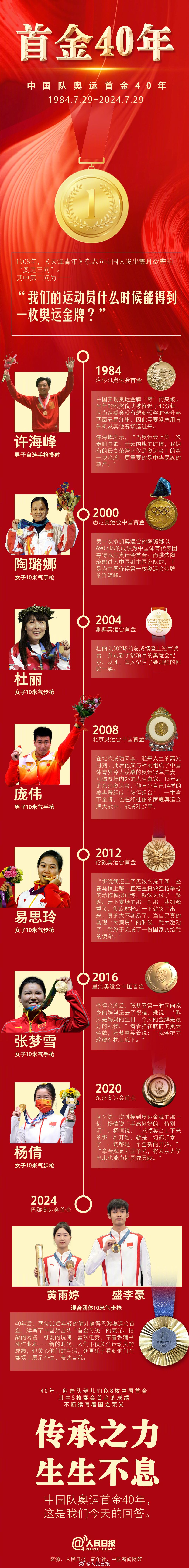 传承之力,生生不息,奥运首金40年,这是一代代中国奥运健儿的回答。